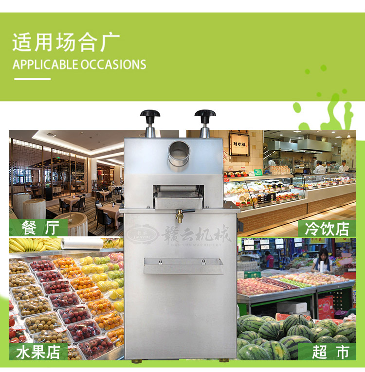 本產品適用于城鄉商場、菜場、商業街等人流量集中區。男女老少均可操作,成本低、利潤高,現榨現賣,是發家致富的好幫手。可加工甘蔗、生姜、蘋果、高粱桿、玉米桿等進行榨汁之用。