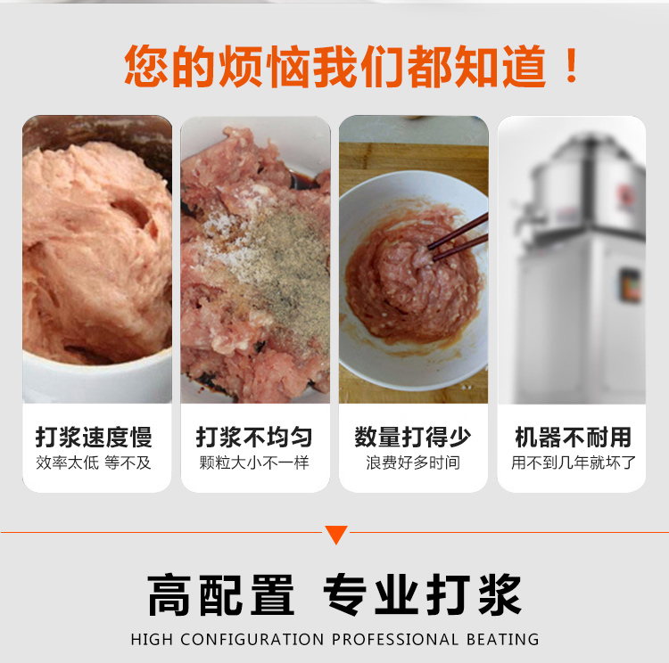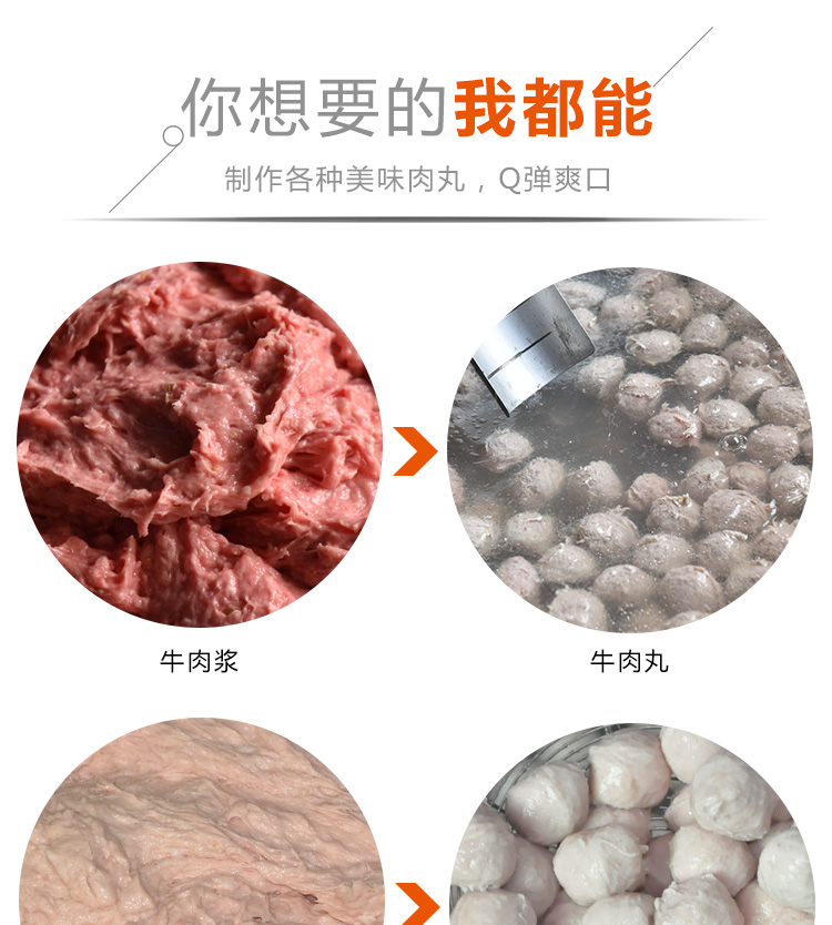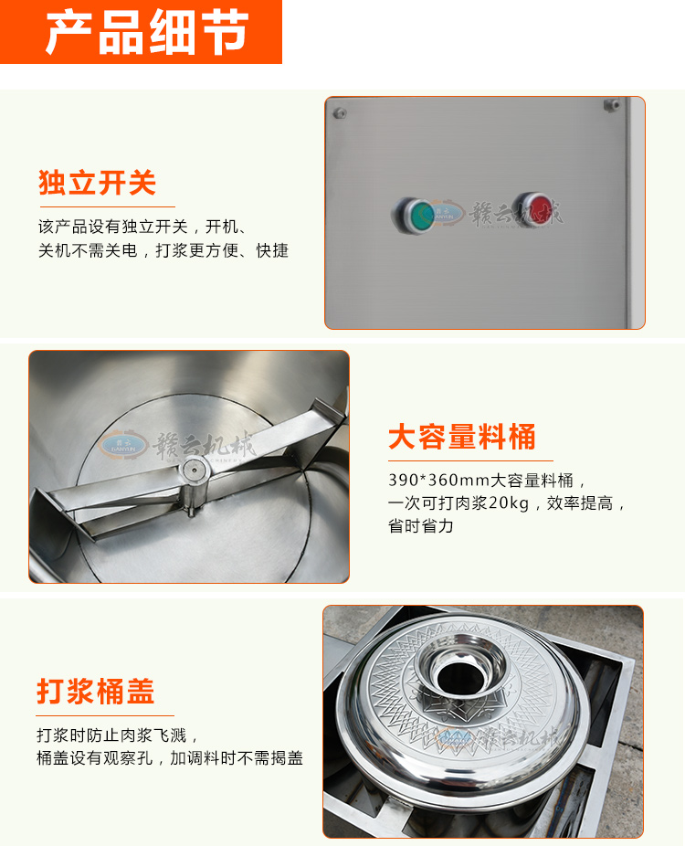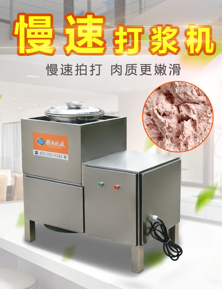 贛云牌36型全封閉式慢速肉丸打漿機選優質不銹鋼,在全不銹鋼慢速肉丸打漿機基礎上將整機外殼用不銹鋼板材封裝,更好的保護電動機,通過小皮帶輪帶動大皮帶輪減速,慢速拍打肉漿。