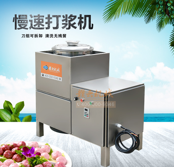 贛云牌36型全封閉式慢速變頻肉丸打漿機選優質不銹鋼,在全不銹鋼慢速肉丸打漿機基礎上將整機外殼用不銹鋼板材封裝,更好的保護電動機,通過小皮帶輪帶動大皮帶輪減速,慢速拍打肉漿。