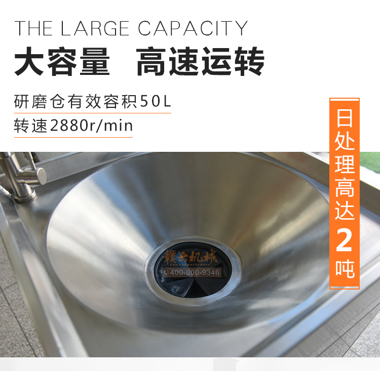 商用垃圾處理器,雙層五級研磨技術,研磨顆粒大小5毫米,食物垃圾連續處理,無懼堵塞可處理的垃圾:殘羹剩飯、肉魚骨刺、蔬菜瓜果、蛋殼、茶葉渣、玉米棒芯、牲畜骨頭、硬質貝克等食物垃圾