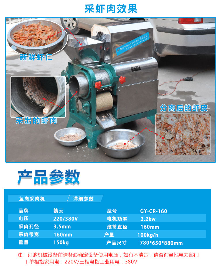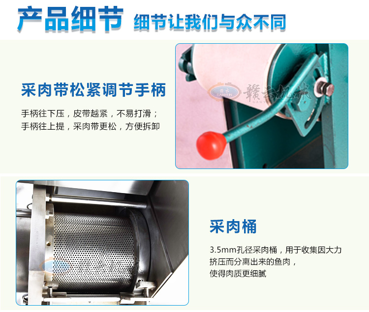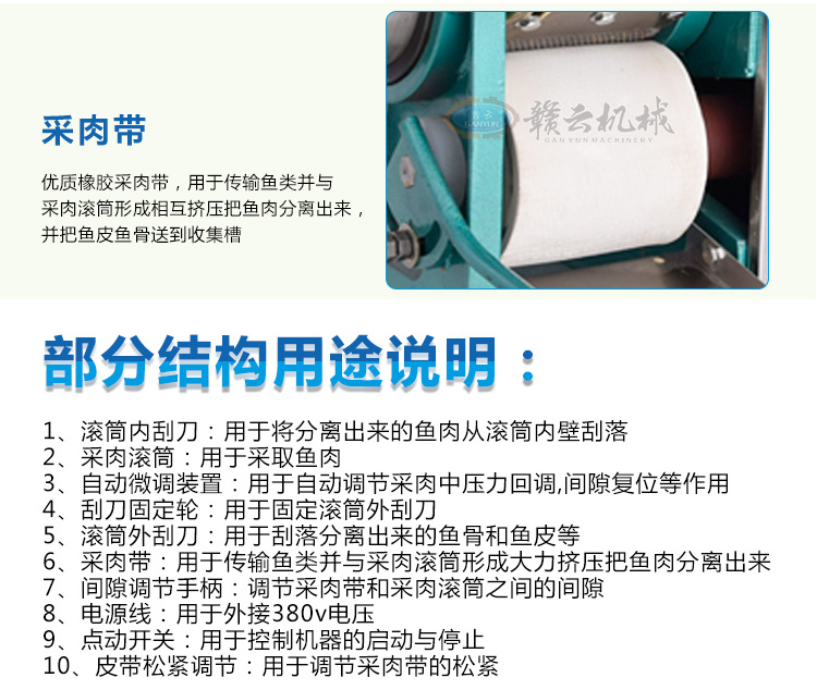 贛云牌新品普通款魚肉采肉機160型帶輪子,便于移動,魚肉魚刺分離原理:切好的魚小塊(整蝦、小蟹、小魚等)通過采肉帶輸送至采肉滾筒與采肉帶間隙,兩則相對滾動產生大力擠壓將魚肉擠入采肉滾筒內,魚刺和魚皮、魚鱗等因采肉滾筒壁小孔直徑只有3.5mm而無法進入,被滾筒外刮刀刮落,完成魚肉與魚骨、魚皮、魚鱗的分離。