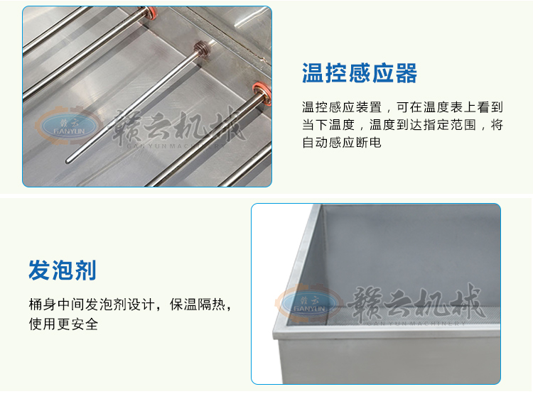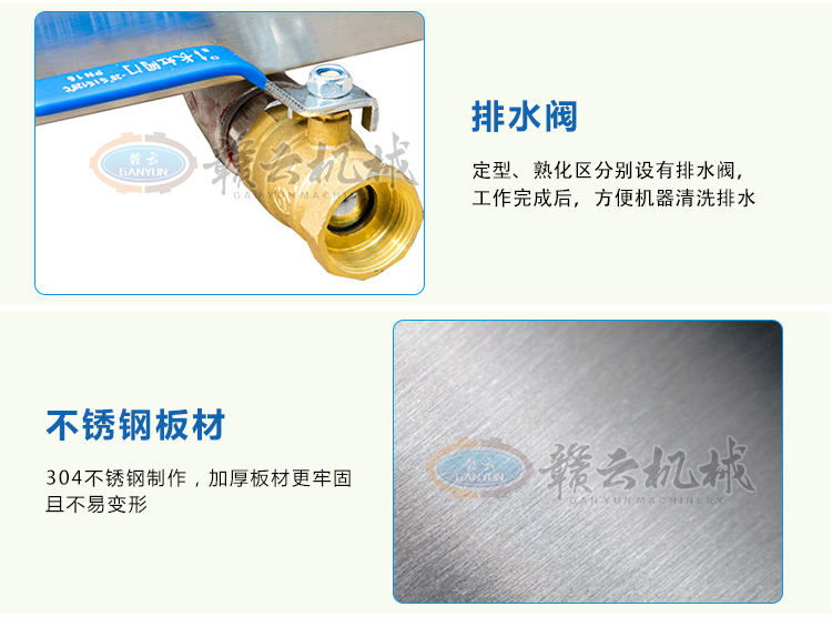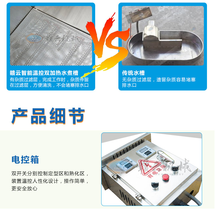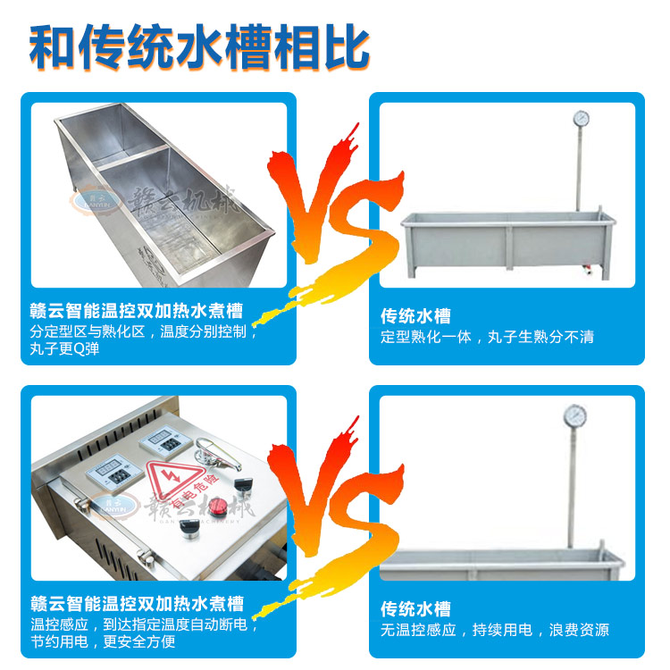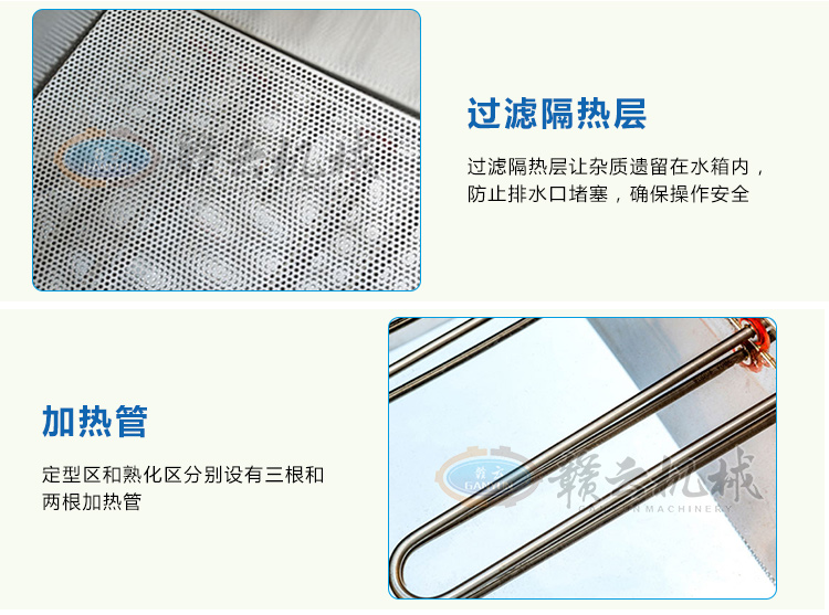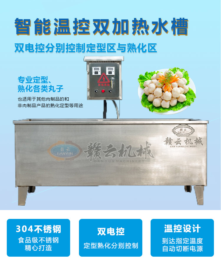 整機采用304不銹鋼板材設計,中間采用發泡劑,取保溫隔熱作用,雙槽加熱,獨立控制,定型熟化分別控制,加熱速度快,省電更省心。本產品量身設計可配套用于我廠生產的包心肉丸機、牛肉貢丸機、墨魚丸成型機、獅子頭成型機、雙調速肉丸機、火鍋丸子機組等多種肉丸成型設備使用??杉佑?,用于油炸丸子的定型熟化,可加水,用于各種肉丸的定型熟化,根據其加熱作用原理,也適用于其他肉制品的和非肉制品產品的熟化定型等用途。