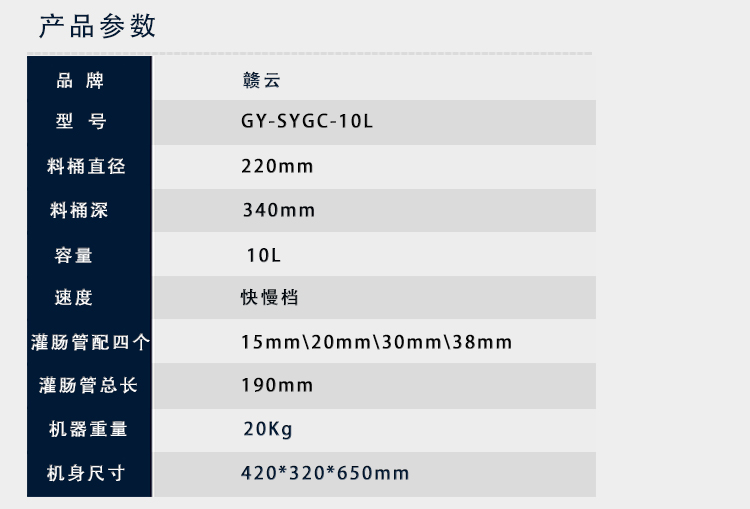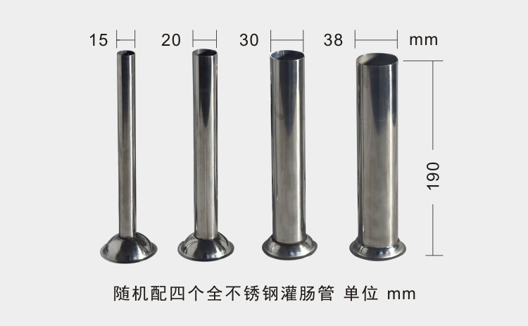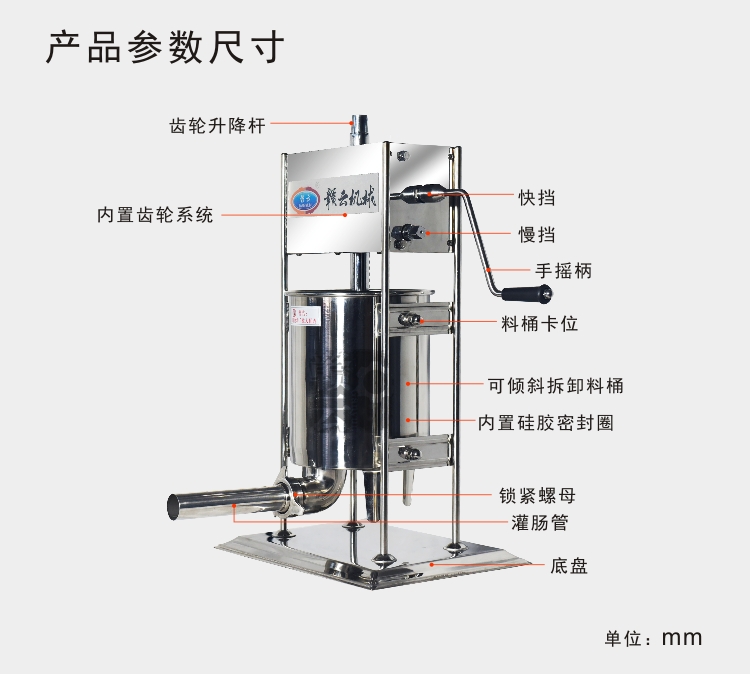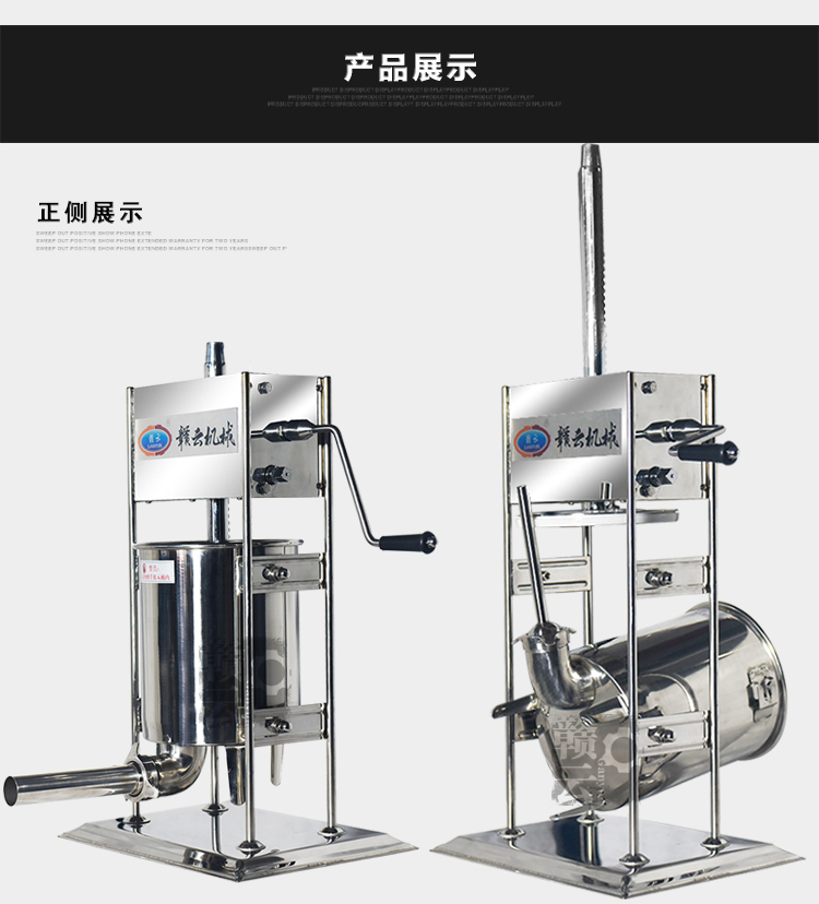 贛云牌立式不銹鋼手搖灌腸機,專業灌制各種腸類,如臘腸、香腸、火腿腸、親親腸。整機采用全齒輪優質拉桿升降系統設計,液壓式灌腸,并兩檔速度可調,并有效利用了機械杠桿省力原理,讓你灌腸輕松自在,灌腸完畢之后還可放心全身水洗,裝料桶亦可方便拆卸,便于清洗。