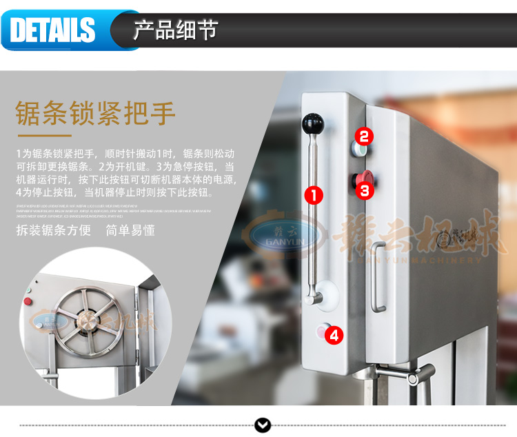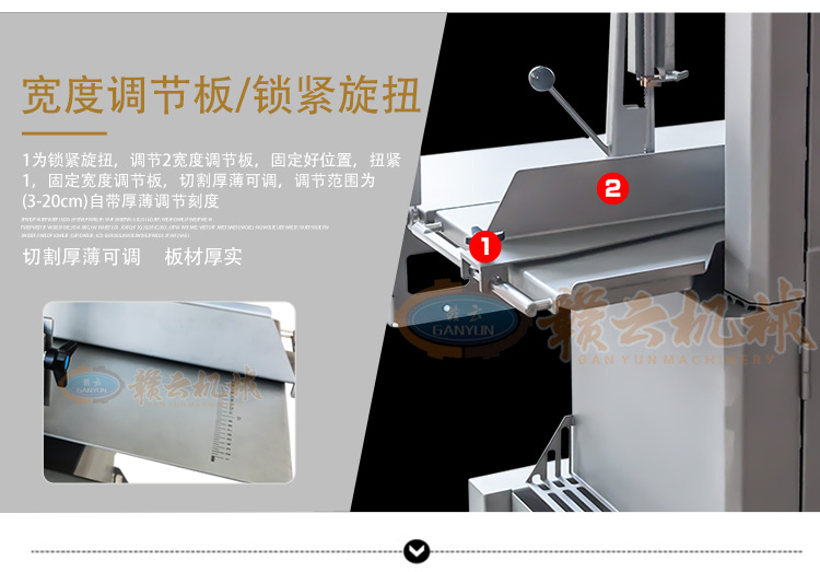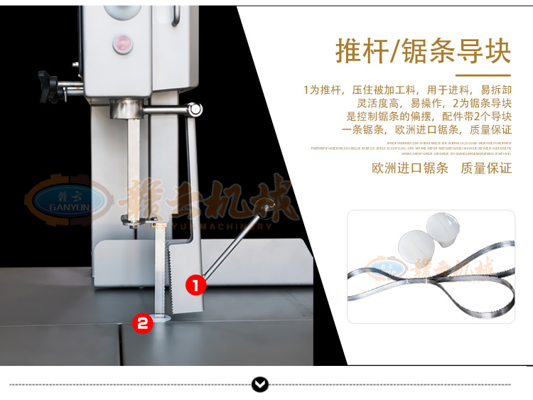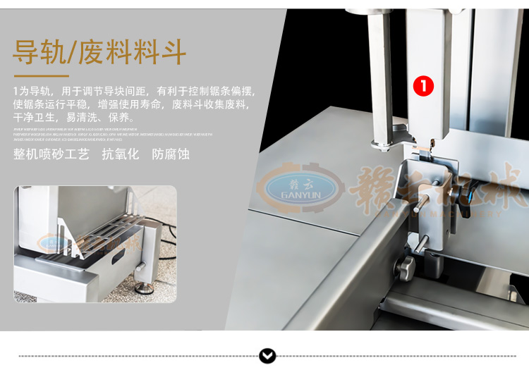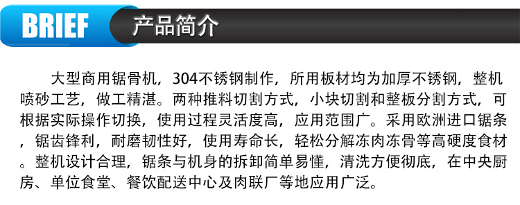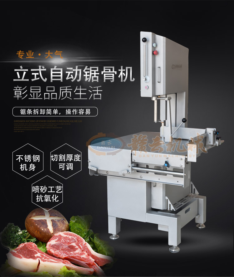 鋸骨機,鋸骨頭用什么,骨頭克星 大型立式商用鋸骨機,304不銹鋼制作,所用板材均為加厚不銹鋼,整機噴砂工藝,做工精湛。兩種推料切割方式,小塊切割和整板分割方式,可根據實際操作切換,使用過程中靈活度高,應用范圍廣。采用優質鋸條,鋸齒鋒利,耐磨韌性好,使用壽命長,輕松分解凍肉凍骨等高硬度食材,整機設計合理,鋸條與機身的拆卸簡單易懂,清洗方便徹底,在中央廚房,單位食堂、餐飲配送中心及肉聯廠等地應用廣泛。