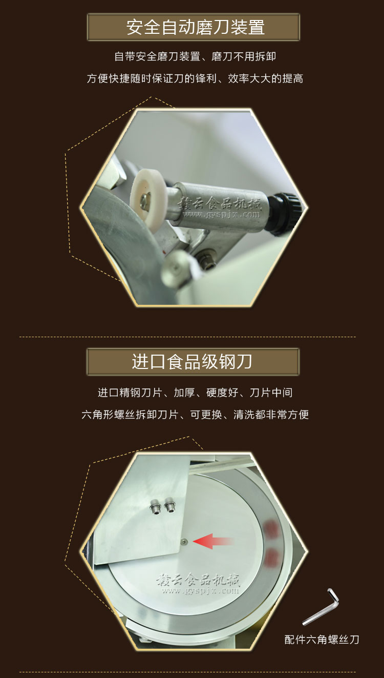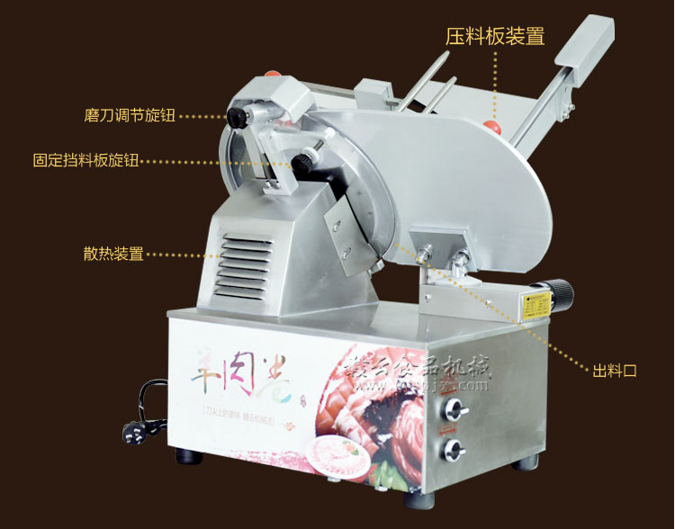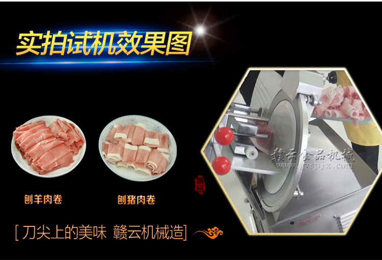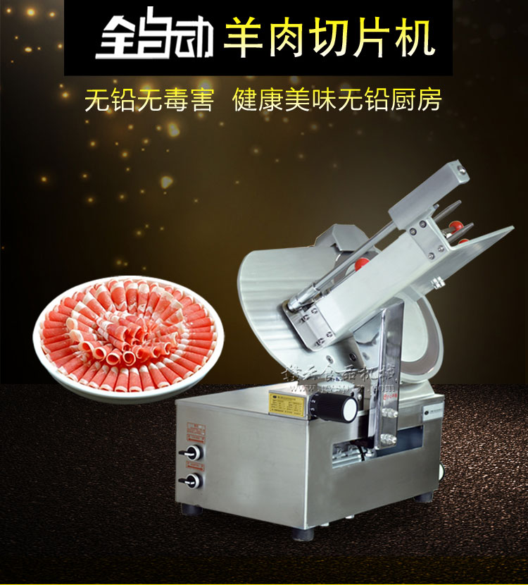 贛云牌全自動羊肉切片機采用加硬不銹鋼刀片,有效的保證了切割效率,切片厚薄可調0-15mm,可切零度以下凍肉,是凍羊肉、牛肉、豬肉切片,切卷利器;該機采用雙電機分別控制切肉刀轉動和推料走動,切肉刀轉動控制開關關閉狀態會自動切斷推料走動電機電源,已確保操作人員的人身安全。整機設計科學合理、美觀大方、省時省力、安全高效,是火鍋店、酒店、西餐等加工羊肉卷信賴的設備。