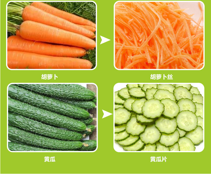 本機是根據多種樣機在實地使用中存在不足之處,反復改進設計制造,采用不銹鋼和全滾動軸承結構,具有外形美觀,成熟可靠,使用維修方便等特點。適用直蔬菜脫水、速凍、保鮮、腌漬等食品行業各類蔬菜。刀片距離可調節在0.1cm-2cm之間即切片、丁、絲厚薄在0.1cm-2cm。