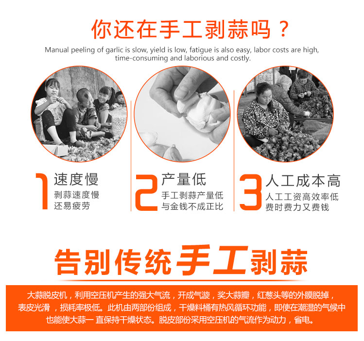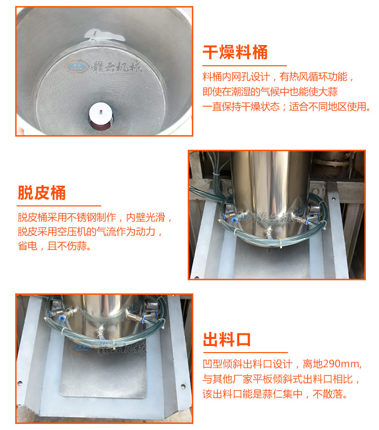 通過電、氣原理控制入料、脫皮、出料程序,實現完全自動化,連續工作,大大降低人力勞動強度