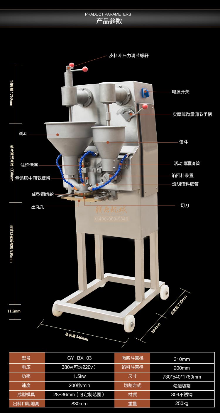 2014冬季新款包心肉丸機,第三代肉丸包心機保留了二代包心機的全部優勢外,在包心成型速度上做了本質上的突破,每分鐘成型200粒的速度是二代包心機的兩倍,機身表面接觸食物部位升級,特殊處理更耐氧化和腐蝕,由于速度上的重大突破,因而稱之為第三代包心肉丸機。