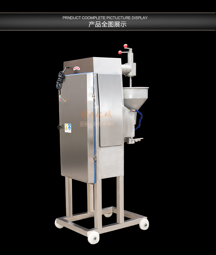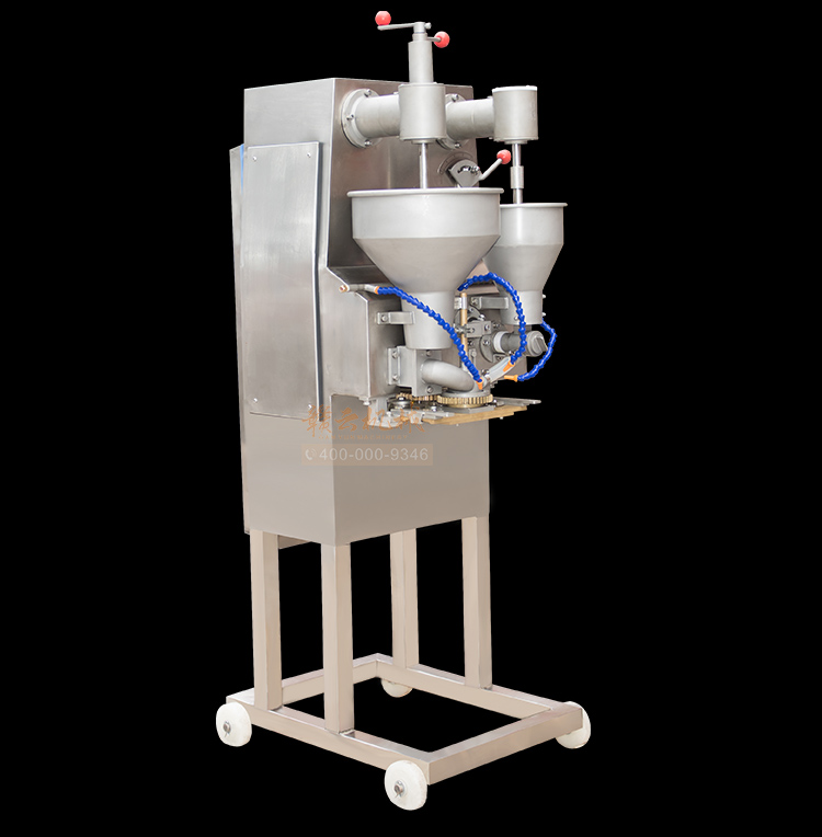 第三代包心肉丸機是在贛云二代包心肉丸機的基礎上,對二代包心機的成型切割部位進行優化提速處理,達到每分鐘200粒的成型速度是二代包心機的兩倍,且推料控制方式還是選用一級絞龍推料和二次泵定量輸送相結合的原理,餡料控制改塑料螺蓋為不銹鋼抗氧化特殊處理螺蓋,餡斗新增絞龍擋板,可有效防止肉餡余留餡斗,更易肉餡的向下擠壓輸送作用,成型旋轉齒輪上新增潤滑滴管,彌補了二代包心機成型區域局部潤滑切刀的缺陷,做出的包心包餡丸表皮光滑,個體圓且大,成型速度快,無小尾巴等優勢。綜上優勢pk二代和目前其他廠家新款式包心肉丸機,故稱之為贛云第三代包心肉丸機!