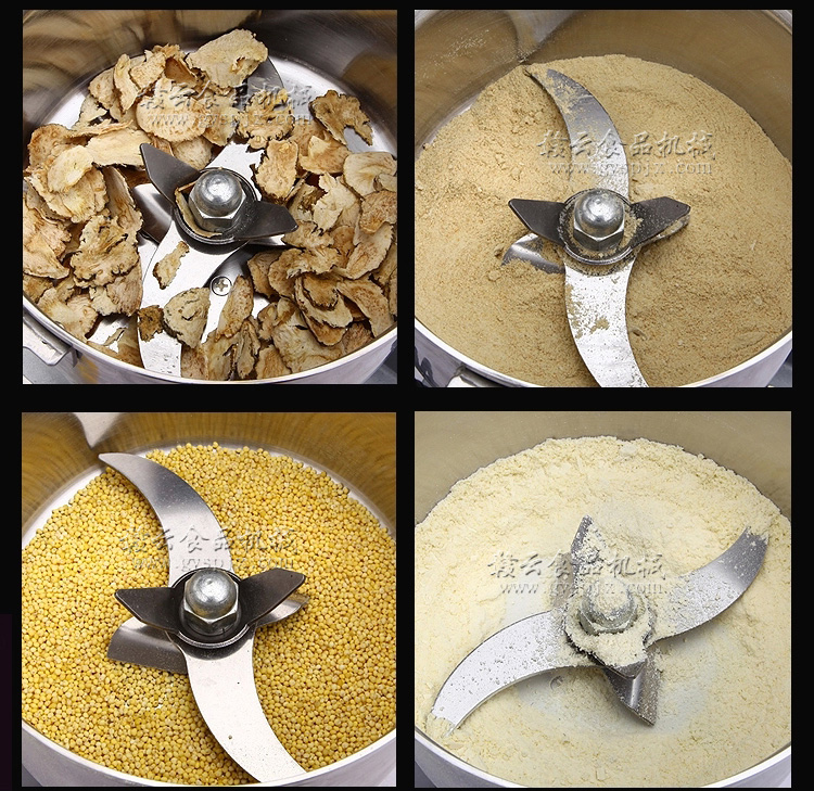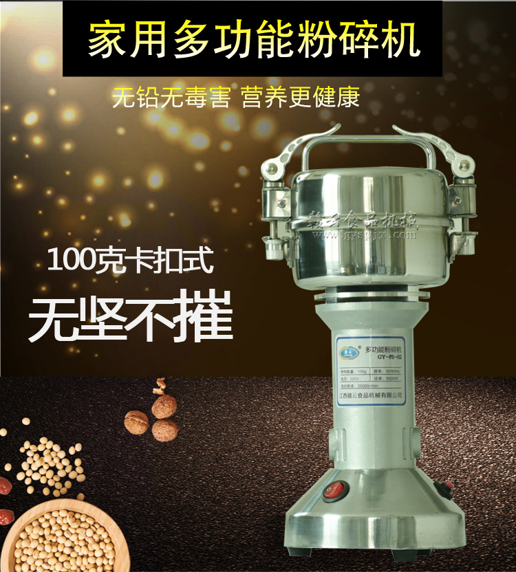 贛云系列多功能粉碎機采用純銅高速電機帶動粉碎刀片將物料快速打成粉末,可用于粉碎五谷、雜糧、田七、阿膠、白叁等,一般粉碎時間1-2分鐘即可,新款粉碎機改保險絲為空氣過載保護器,使用更安全,我廠提供的粉碎機有100克-1000克不同型號的多功能粉碎機。