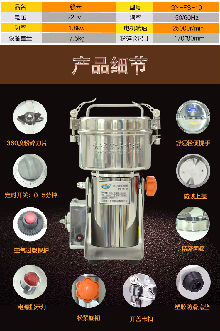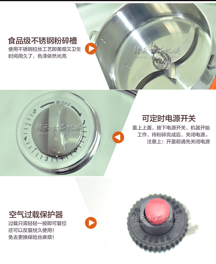 贛云系列多功能粉碎機采用純銅高速電機帶動粉碎刀片將物料快速打成粉末,可用于粉碎五谷、雜糧、田七、阿膠、白叁等,一般粉碎時間1-2分鐘即可,新款粉碎機改保險絲為空氣過載保護器,使用更安全,我廠提供的粉碎機有100克-1000克不同型號的多功能粉碎機。