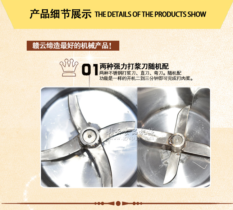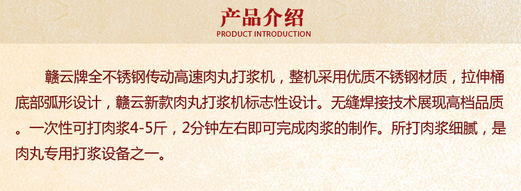 贛云牌全不銹鋼傳動高速肉丸打漿機,整機采用優質不銹鋼材質,拉伸桶底部弧形設計,贛云新款肉丸打漿機標志性設計。無縫焊接技術展現高檔品質。一次性可打肉漿4-5斤,2分鐘左右即可完成肉漿的制作。所打肉漿細膩,是肉丸專用打漿設備之一。
