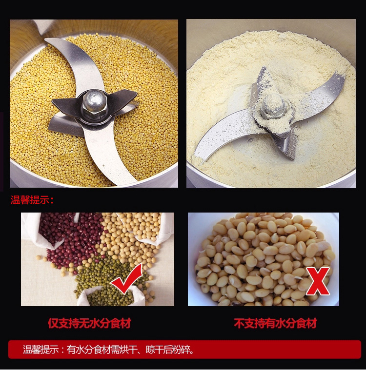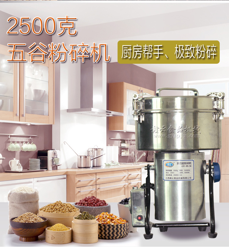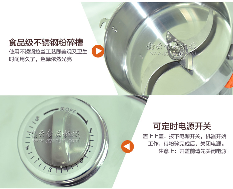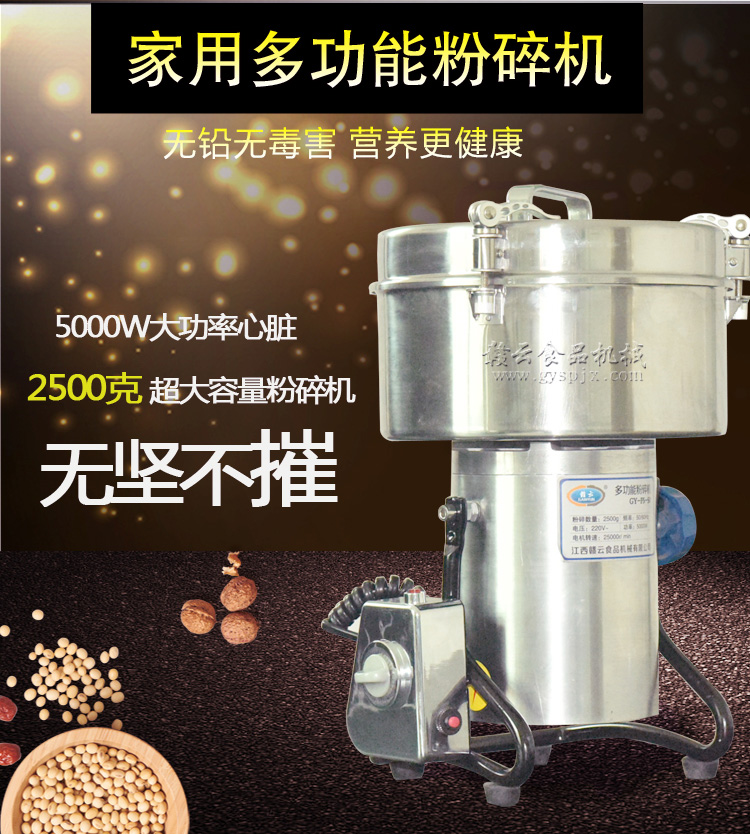 贛云系列多功能粉碎機采用純銅高速電機帶動粉碎刀片將物料快速打成粉末,可用于粉碎五谷、雜糧、田七、阿膠、白叁等,一般粉碎時間1-2分鐘即可,新款粉碎機改保險絲為空氣過載保護器,使用更安全,我廠提供的粉碎機有100克-1000克不同型號的多功能粉碎機。