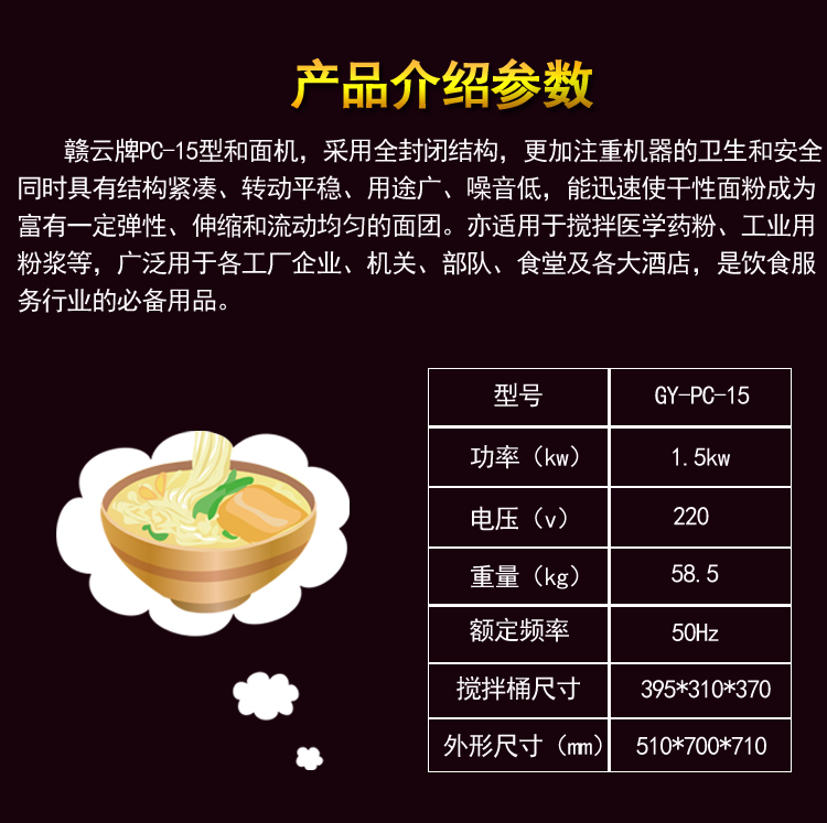 贛云牌PC-15型和面機,采用全封閉結構,更加注重機器的衛生和安全同時具有結構湊、轉動平穩、用途廣、噪音低,能迅速使干性面粉成為富有一定彈性、伸縮和流動均勻的面團。亦適用于攪拌醫學藥粉、工業用粉漿等,廣泛用于各工廠企業、機關、部隊、食堂及各大酒店,是飲食服務行業的必備用品。