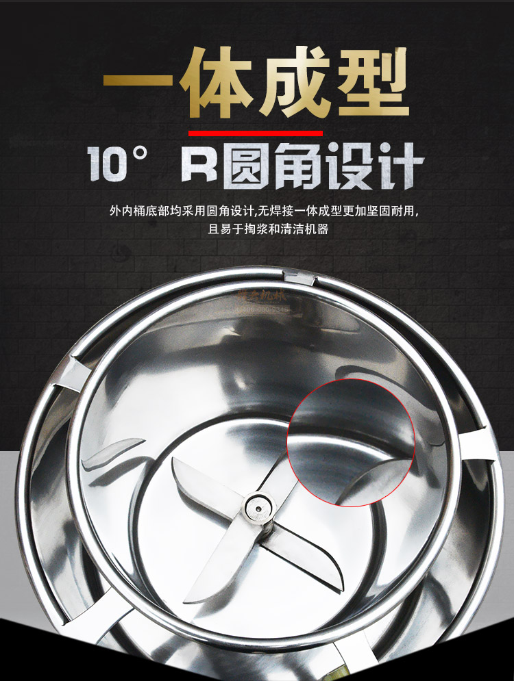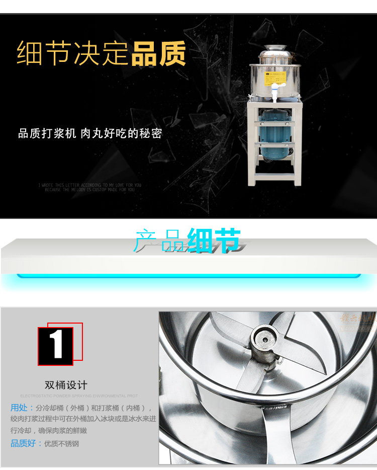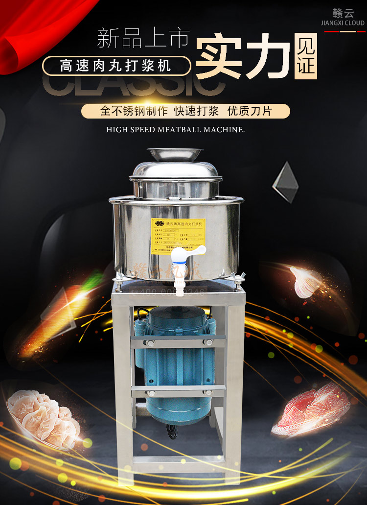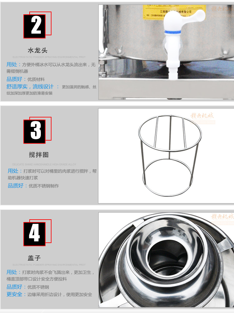 贛云牌肉丸打漿機采用全不銹鋼材質,默認配用1.5kw國標銅線贛云牌電動機,打漿刀片和刀架、攪拌圈、蓋子、支持架、打漿雙桶、軸承、螺絲均采用不銹鋼材質,是正真意義上全不銹鋼