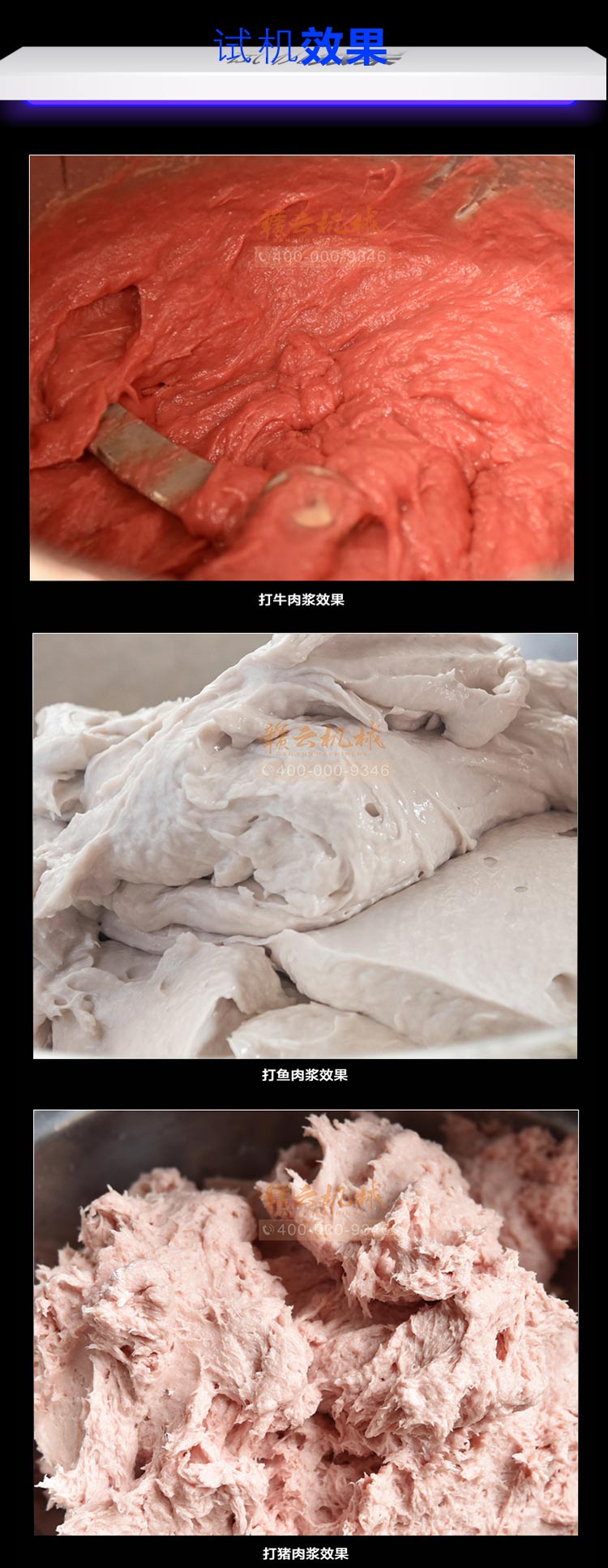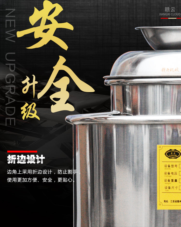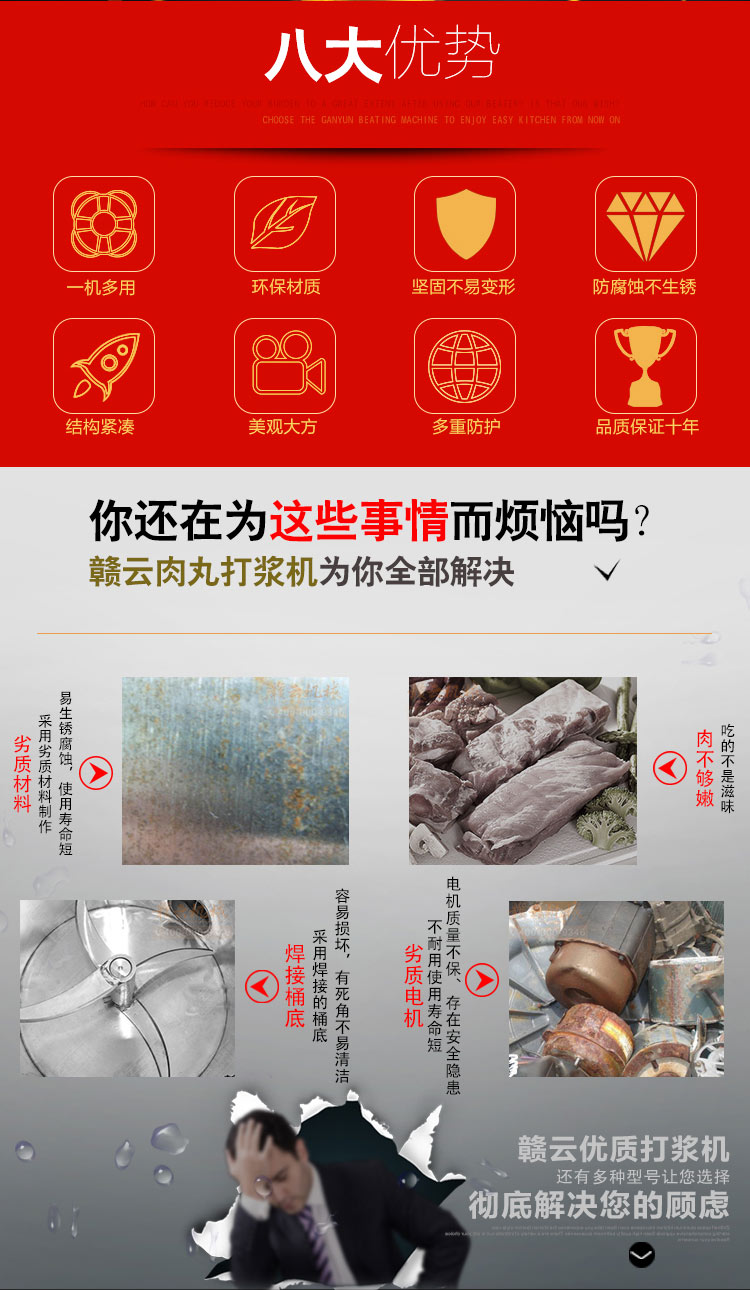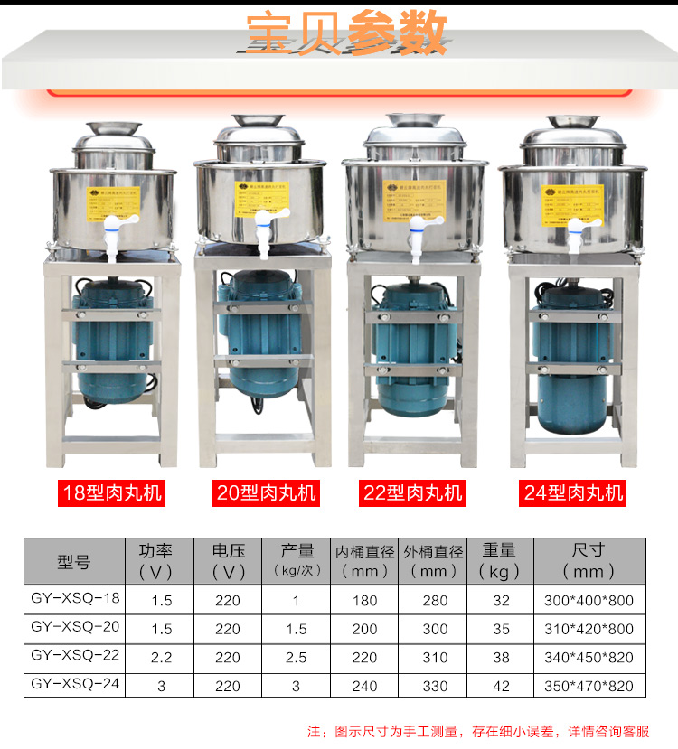 贛云牌肉丸打漿機采用全不銹鋼材質,默認配用1.5kw國標銅線贛云牌電動機,打漿刀片和刀架、攪拌圈、蓋子、支持架、打漿雙桶、軸承、螺絲均采用不銹鋼材質,是正真意義上全不銹鋼