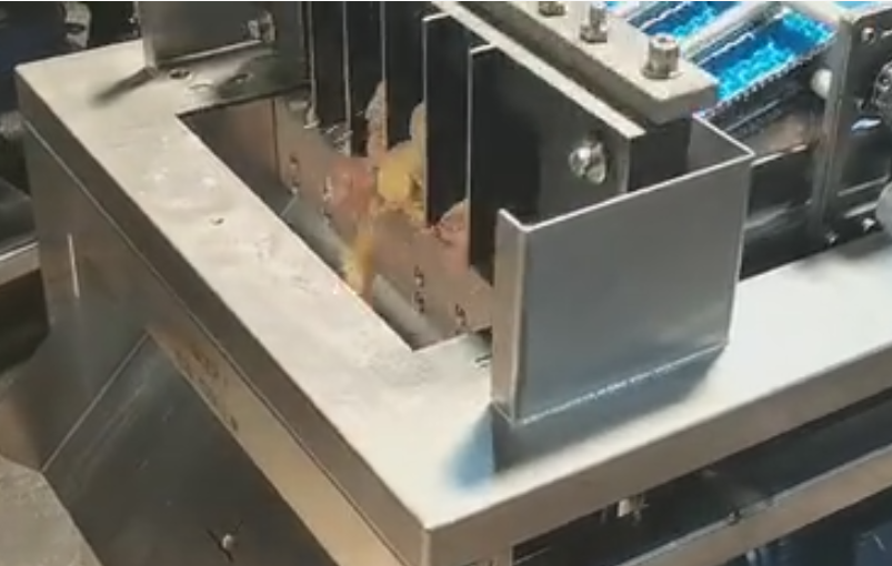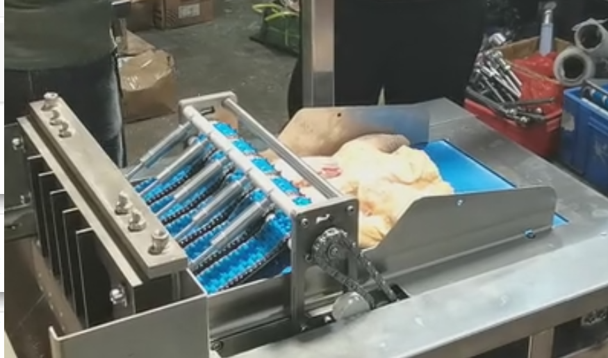 把雞肉放到傳送帶上,通過刀的時候可以看出切割雞肉非常迅速穩定,大小也均勻。